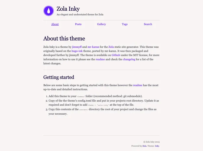 Zola-Inky is an elegant and understated theme for the Zola static site generator. Originally based on the hugo-ink theme, Zola-Inky has been further developed and packaged by jimmyff and mr-karan. With its responsive design, responsive images, and customizable features, Zola-Inky offers a versatile and visually pleasing theme for Zola users.