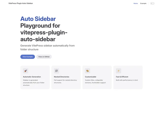The VitePress Plugin: Auto Sidebar is an essential tool for anyone looking to enhance their documentation process with automatic sidebar generation. Designed to work seamlessly within VitePress environments, this plugin simplifies the creation of organized sidebars by leveraging your folder structure. Whether you're dealing with nested directories or simply wish to customize the titles of your sections, this plugin brings efficiency and ease to documentation management.