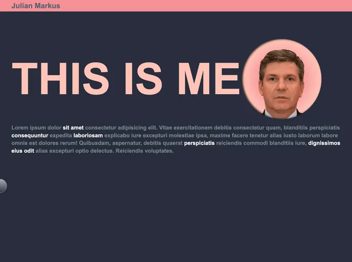 A portfolio website for a fictional person. The design style consists of oversized texts and a highly used main color.