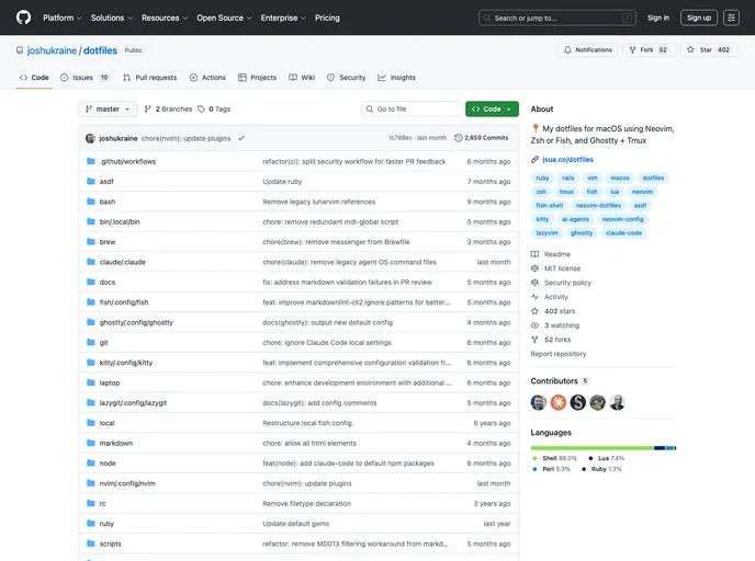 This customized dotfile repository delivers a powerful combination of tools, including shell support for Zsh and Fish that provides near-universal functionality through shared configurations. Add in the fast setup utility of GNU Stow and a bootstrap process modeled after thoughtbot’s Laptop, and you have a recipe for an exceptional coding experience.