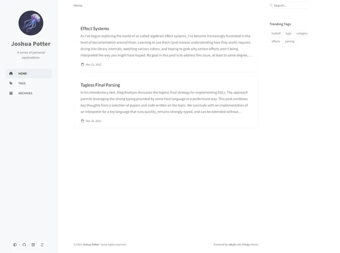- Chirpy theme: The blog is themed with Chirpy, a customizable and responsive theme that enhances the visual appeal of the blog.