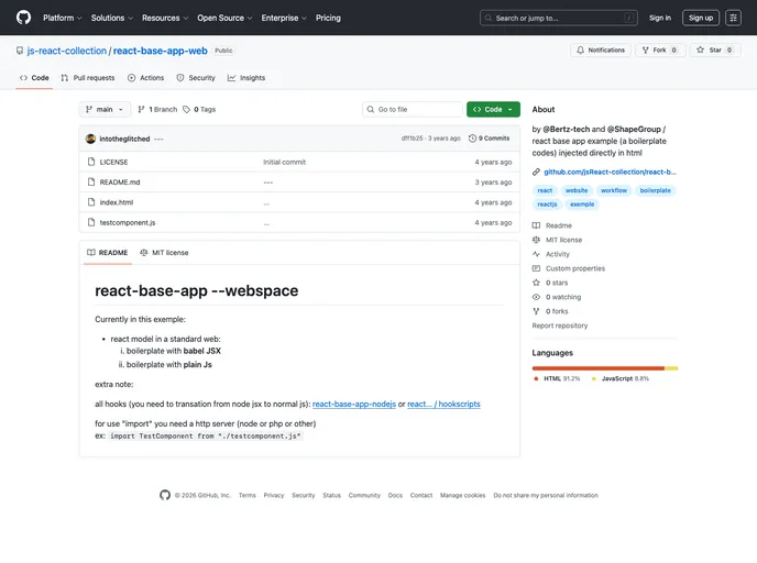 by @bertz-tech and @ShapeGroup / react base app example (a boilerplate codes) injected directly in html