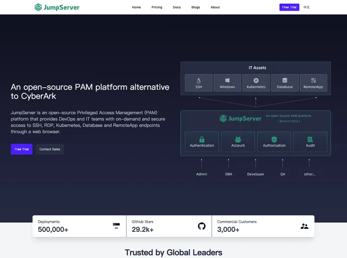 JumpServer is an open-source Privileged Access Management (PAM) platform that provides DevOps and IT teams with on-demand and secure access to SSH, RDP, Kubernetes, Database and RemoteApp endpoints through a web browser.