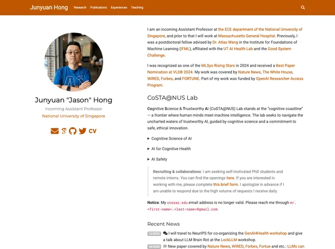 Junyuan's Customized Academic Website Hugo Theme is a customized theme used by Junyuan Hong. Based on the Wowchemy Academic Theme driven by Hugo, this theme offers additional features and customizations. It includes a publication section with filter buttons, a showcase design view for the featured widget, a fixed avatar when scrolling, and a new citation format. The theme is available for use and can be customized for personal preferences.
