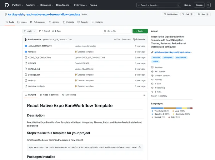 React Native Expo BareWorkflow Template with React Navigation, Themes, Redux and Redux-Persist installed and configured