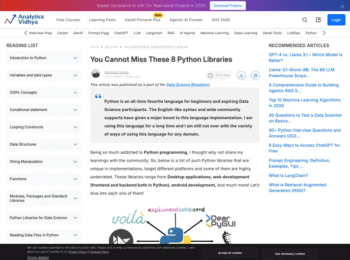 This product is a repository containing demo code for various libraries discussed in the Analytics Vidya Article titled "You Cannot Miss These 8 Python Libraries." The repository provides a practical demonstration of the libraries mentioned in the article, enabling users to explore and experiment with their functionalities.