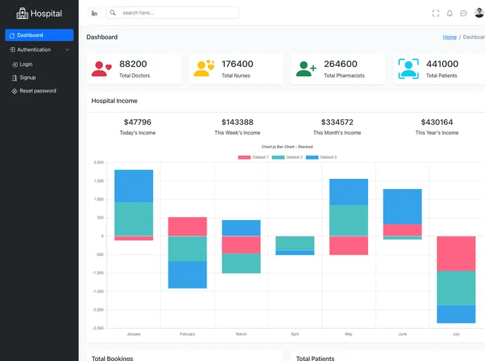 A minimalistic hospital dashboard template built using React, Bootstrap, Typescript and Chartjs.
