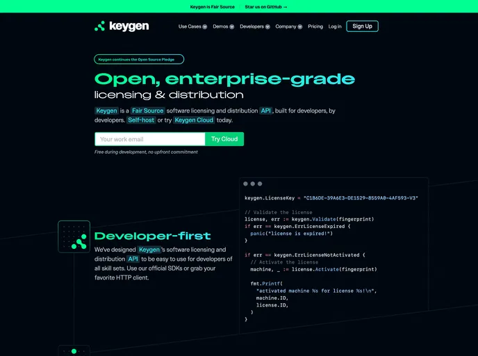 Keygen is a modern, fair source software licensing and distribution API. For developers, by developers.