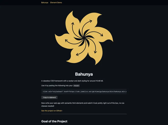 Bahunya is a cutting-edge classless CSS framework designed to enhance the aesthetic of web applications without the clutter of CSS classes. With a lightweight footprint of approximately 10.46 kB, it allows developers to create visually appealing websites using only semantic HTML elements. This innovative approach not only simplifies the styling process but also improves accessibility for users, making it a valuable tool for both novice and experienced developers.