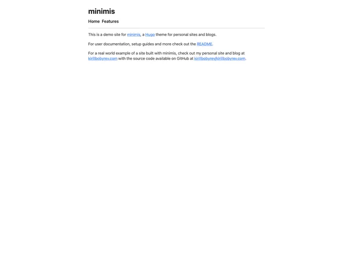 The minimis theme is a minimalistic theme designed for personal websites built with Hugo. Its main goal is to provide a small and focused codebase that is easy to understand and avoids unnecessary feature bloat. The theme is inspired by bearblog and hugo-bearblog, but includes additional features that the creator found missing and wanted to customize. The theme is simple and does not rely on complicated CSS frameworks or heavy dependencies. It includes a live demo and example website, as well as a GitHub Actions-based workflow for automatic deployment to GitHub Pages with a custom domain.