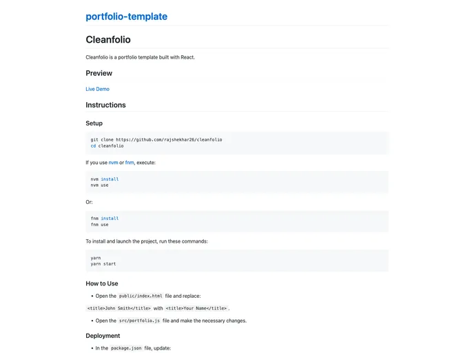 Cleanfolio is a portfolio template built with React. It provides a clean and simple design that is perfect for showcasing your work.