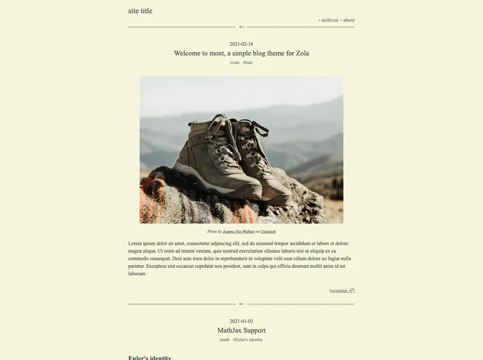 The Mont theme is a simple blog theme designed specifically for Zola. It offers a clean and minimalistic design, making it ideal for bloggers who want a sleek and uncluttered look for their website. The theme includes pagination on the index page, so users can easily navigate through multiple articles without having to click on each individual title.