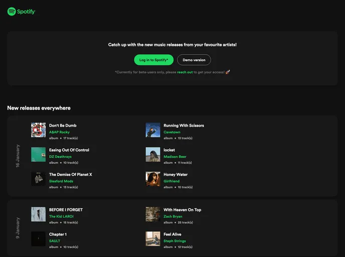 Spotify Releaser is an app that allows users to track new music releases from their favorite artists on Spotify. Users can get a list of new albums and singles of artists or songs they have liked on Spotify. The app also provides the ability to filter releases by type and view releases from as far back as last year.