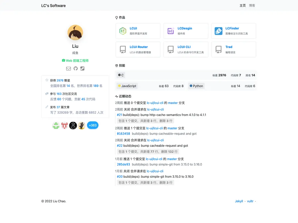 The lc-soft.iolc-sft.io website source code is built using Jekyll and consists of purely static pages. The code repository includes page source code for the main site, blog, and LCUI. To install the theme, Node.js needs to be installed along with the necessary dependencies. Running the build.sh script generates the pages, and a server should be launched in another terminal to start the build. Optional steps include running the flask server in the API for automatic website updates and configuring Webhooks in GitHub.