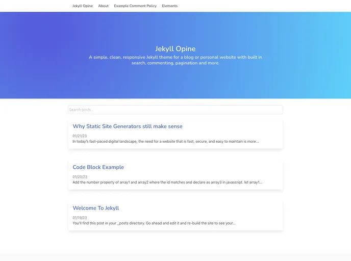The Jekyll Opine Theme is a simple and clean responsive Jekyll theme designed for blogs or personal websites. It includes built-in features such as search functionality and commenting. This theme provides an easy-to-use and customizable platform for users to create their own blog or personal website.
