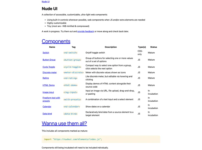 Nudeui is an innovative toolkit designed for creating form components, likened to a "kitchen sink" approach, where a multitude of components are provided to fulfill various user interface needs. Currently a work in progress, it invites users to explore its potential while keeping in mind that it may not yet be fully polished. This intriguing blend of utility and experimentation encourages early adopters to dive in and test the waters.