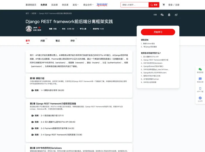 快速入门Django REST framework,学会开发一套自己的RESTful API服务,并且自动生成API文档。视频学习地址: