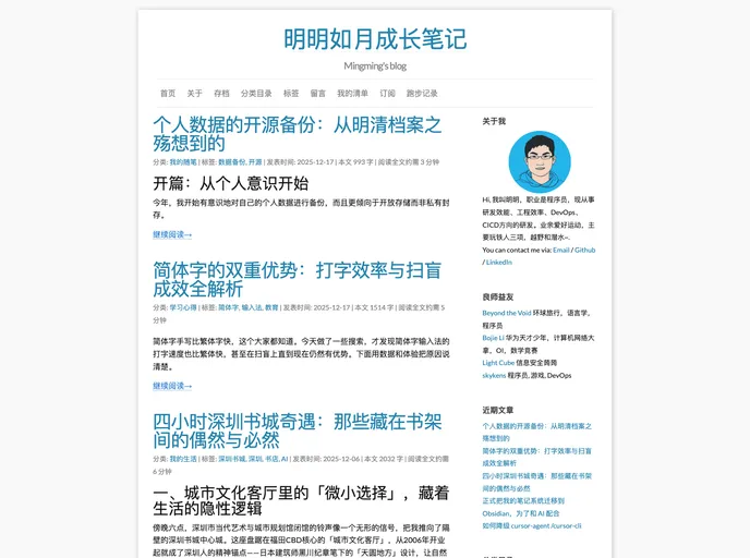 Mingming's blog is powered by Jekyll and is based on the Freshman21 Design theme. It offers features such as customizable homepage, local debugging in Docker, and integration with GitHub Pages. The blog has been regularly updated with new pages, optimizations, and analytics updates. However, the content does not include an installation guide for the theme.