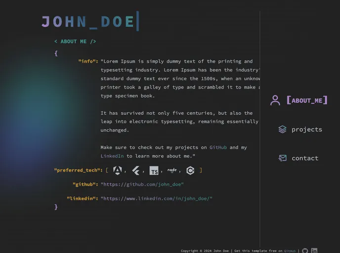 HTML Code theme template for developers or tech enthusiasts who want to showcase their personal information in a unique and stylish way.
