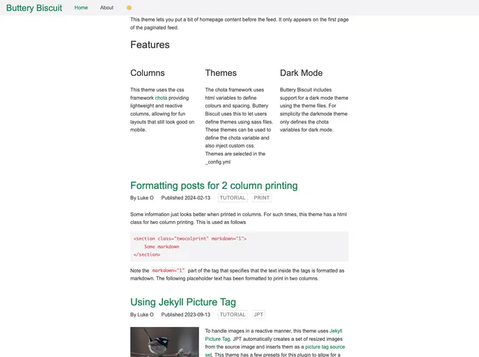 This Jekyll theme is a base, a buttery biscuit base. The goal is to have a theme that is easy to customise whilst using as a Gem based theme, resulting is a basic frame work for any Jekyll project. Made using chota as a css framework and Gutenberg for print styling