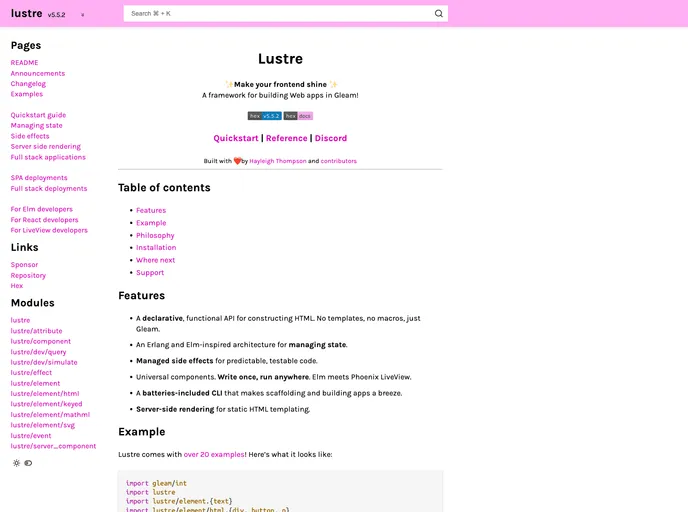 Lustre is an opinionated web framework built for small-to-medium-sized web applications. It aims to simplify the complexities of modern frontend development by providing a declarative, functional API for constructing HTML without the need for templates or macros. Inspired by Erlang and Elm, Lustre offers a managed state system, predictable code due to managed side effects, universal components that can run across different platforms, and server-side rendering capabilities.