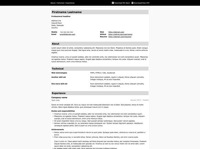 Responsive resume template design from a sane 760px down to mobile, with some simple print styles to boot.
