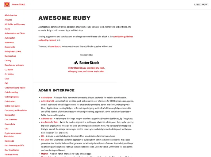 The Ruby community continues to thrive with an impressive array of libraries, tools, and frameworks that cater to modern app development. This collection acts as a categorized resource, providing developers with convenient access to the essential Ruby offerings needed to build dynamic Web Apps and services. With a strong emphasis on community contributions, it's clear that every addition enhances the treasure trove of resources available. Whether you're a seasoned developer or just stepping into Ruby, you'll find a wealth of opportunities to explore and utilize in your projects.