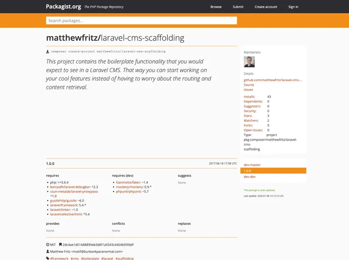 This project contains the boilerplate functionality that you would expect to see in a Laravel CMS. That way you can start working on your cool features instead of having to worry about the routing and content retrieval.