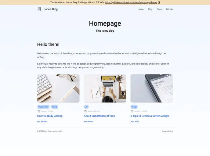 Berg is a clean and modern responsive blog theme designed for Hugo. With its clean aesthetics and modern design, Berg offers a visually appealing way to showcase your blog content. Whether you're a personal blogger or a professional writer, Berg provides a user-friendly and responsive experience for your readers.