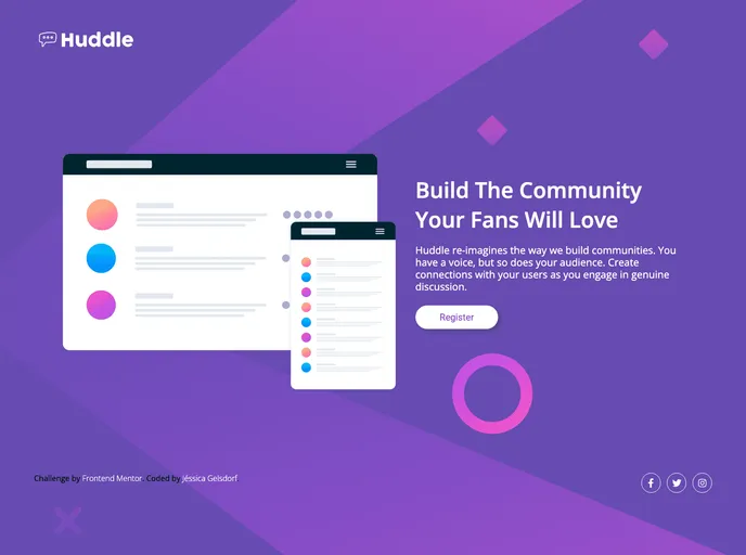 The Huddle landing page is a solution to the Frontend Mentor challenge that aims to improve coding skills by building realistic projects. It features a single introductory section and makes use of HTML and CSS, with the Flexbox property for layout and responsiveness.