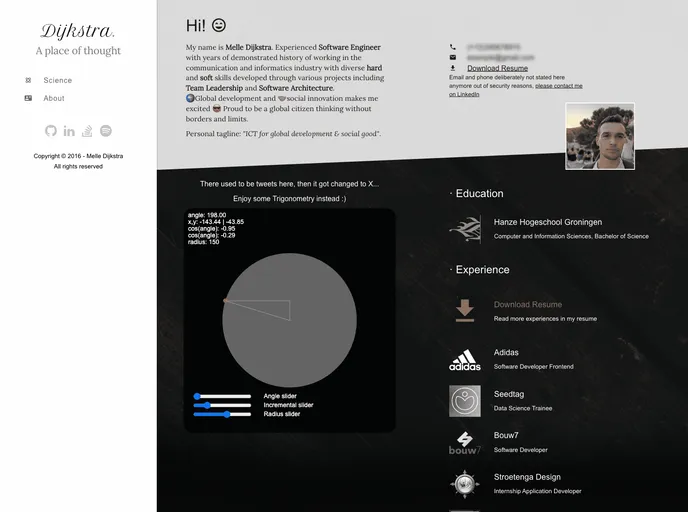 Melle Dijkstra's personal website is a repository containing the official source code for their personal website. The website is copyright protected from 2016 to 2018 by Melle Dijkstra.