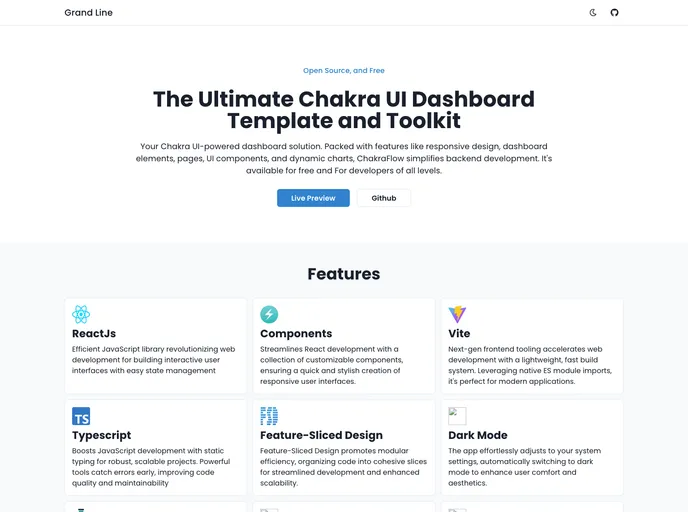 The Grand Line is an ultimate Chakra UI Dashboard Template and Toolkit that offers a comprehensive set of features and tools for developers. It combines the power of React, ChakraUi, Feature-Sliced Design, Vite, Typescript, i18next, React Router Dom, and React Helmet to provide a seamless and efficient development experience.