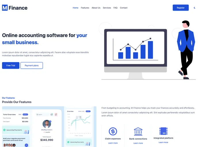 FREE Modern Finance home page template that supports light and dark theme, built with Tailwind CSS