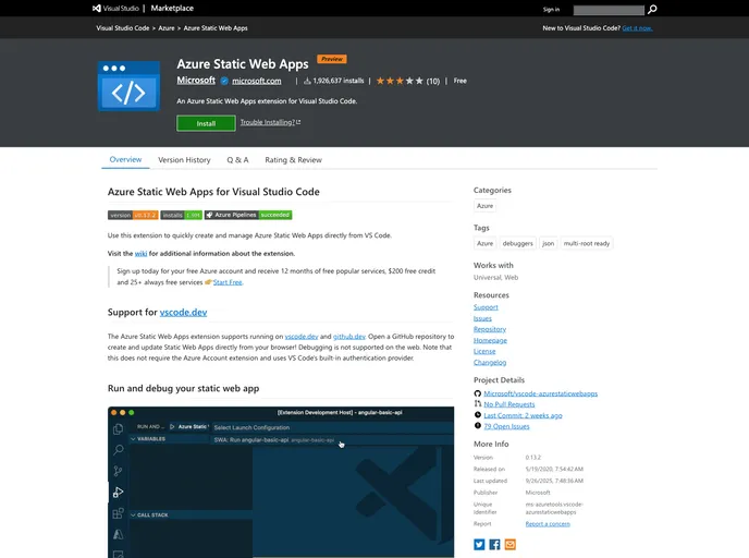 Dynamic Debugging: The extension provides tools to debug your static web app with a dynamic configuration, greatly improving the development process.