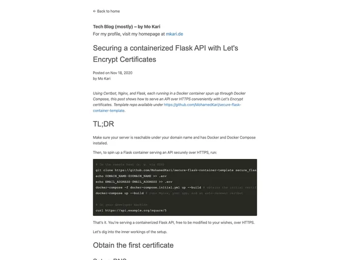 Setting up secure APIs can be a daunting task for many developers, especially when it comes to handling SSL certificates and ensuring that data is transmitted securely. Thankfully, the combo of Docker, Nginx, and Let's Encrypt creates an efficient and reliable solution for serving Flask APIs over HTTPS. This setup not only simplifies the deployment process but also enhances the security of your application by automatically managing SSL certificates.