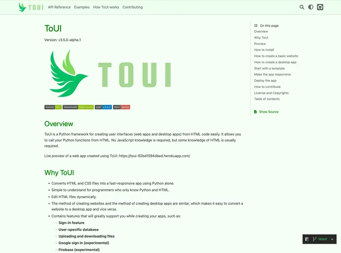 ToUI is an innovative Python framework designed to simplify the creation of user interfaces for web and desktop applications using basic HTML code. It is an ideal tool for developers who are familiar with Python and HTML but may not possess extensive JavaScript knowledge. By streamlining the development process, ToUI allows users to call Python functions directly from their HTML, making it easy to create dynamic, responsive applications.
