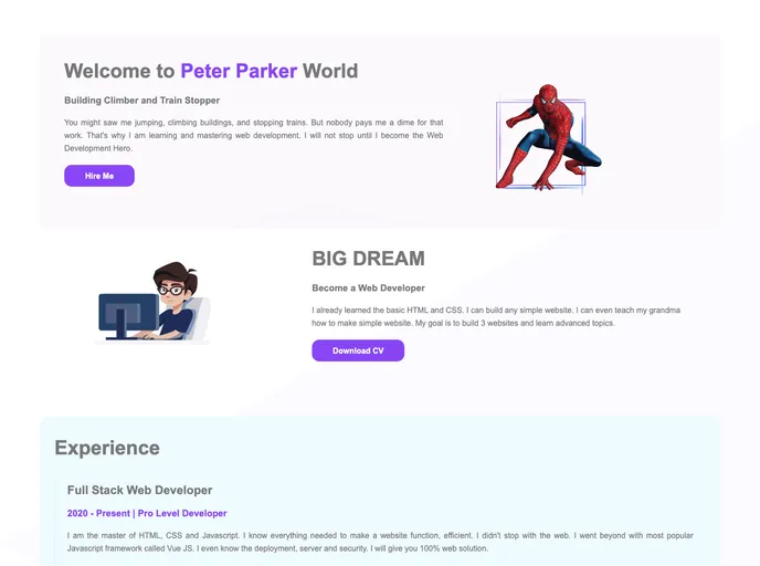 The "peter-parker-portfolio" is a simple landing page created by the author while completing the "Complete Web Development Course" from Programming Hero Mobile App. The web page is developed using only HTML and CSS.
