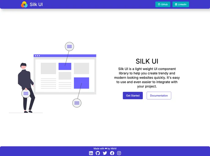 Silk UI is a light weight UI component library to help you create trendy and modern looking websites quickly. It's easy to use and even easier to integrate with your project.