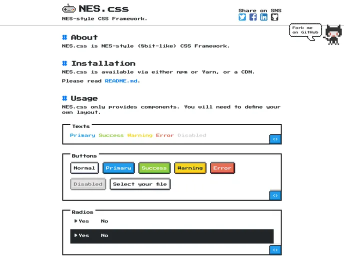 Font Recommendations: While NES.css doesn't include fonts, it suggests using "Press Start 2P" for an authentic feel, along with other fonts for non-English characters.