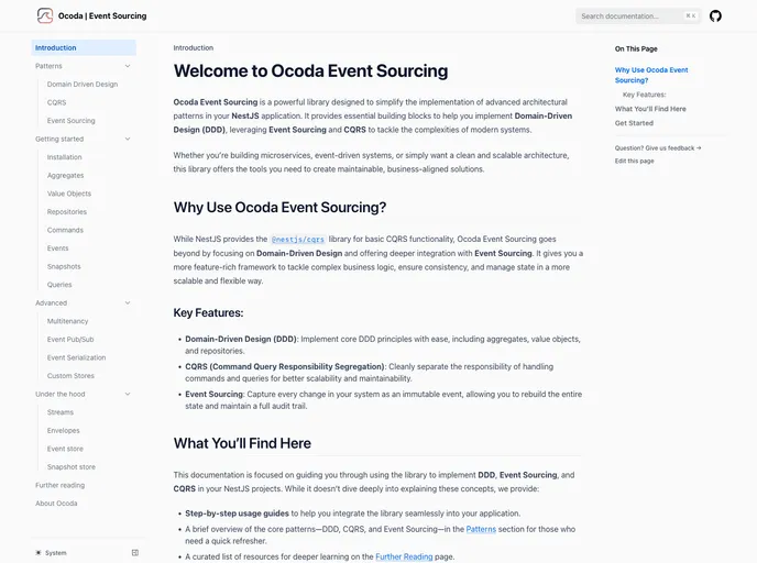 Whether you're an experienced developer or just starting with NestJS, @ocoda/event-sourcing offers a user-friendly approach to enacting these advanced design patterns. Its well-structured documentation ensures a smooth onboarding process, making it easier to integrate into your existing projects.