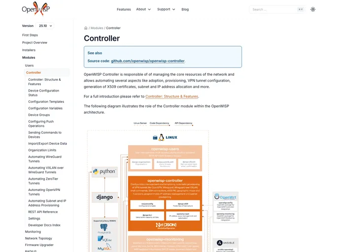 Openwisp Controller is a versatile and powerful tool for managing network and WiFi configurations. It stands out as a robust solution for provisioning, configuration management, and updates. Whether you prefer pulling configurations via openwisp-config or pushing them through SSH, this controller adapts to your needs, optimizing network performance across various systems, with a strong emphasis on OpenWRT.