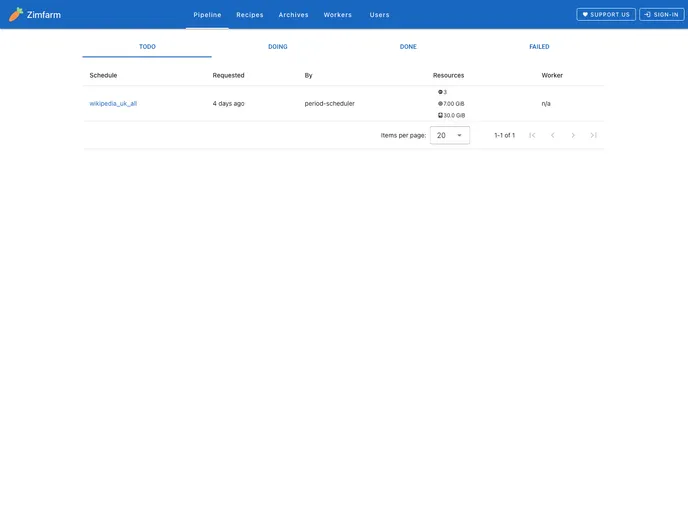 User-Friendly Frontend: Available at farm.openzim.org, the frontend allows users to create, clone, and edit recipes, along with tracking task progress in an intuitive interface.
