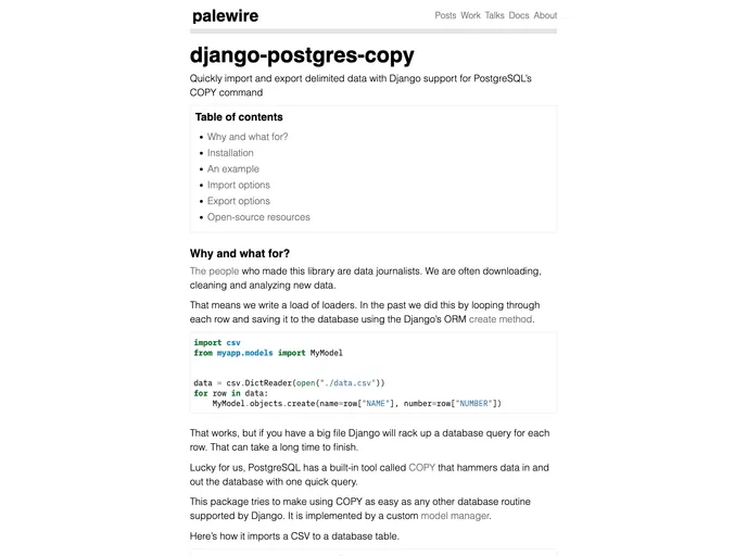 This package provides a robust and efficient way to handle data transfers, making it an essential addition to any Django project that leverages PostgreSQL. With active development and a community behind it, there are plenty of resources to help you get started and troubleshoot any issues along the way.