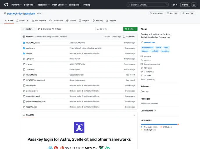 Passkey library that works with React/Next.js, Vue, SvelteKit, Django and many other frameworks.