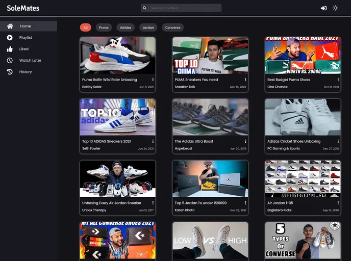 SoleMates is a video library web app that consists of a collection of videos. It has features such as like videos, creating playlists, adding videos to playlists, adding to watch later, history, feed, etc. but of a specific niche.
