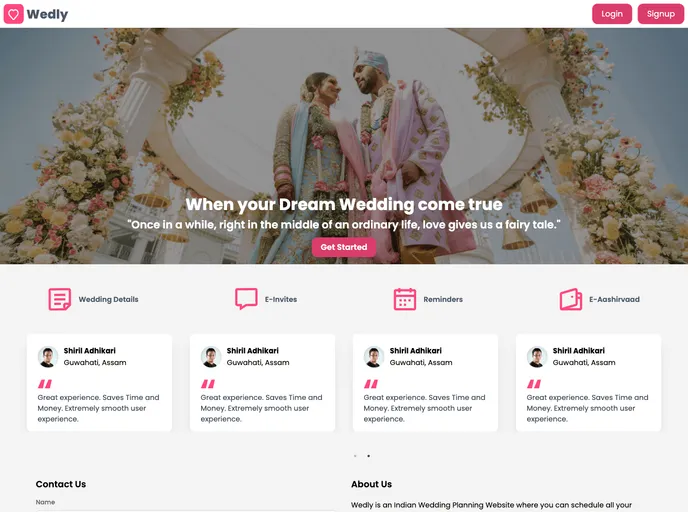 Wedly is a web application that a person or a family can use to store wedding details, guest lists, and event details. The user can send E-Invites and then reminders before every event to the guests. The guest can send “Aashirvaad” to bless the couple.