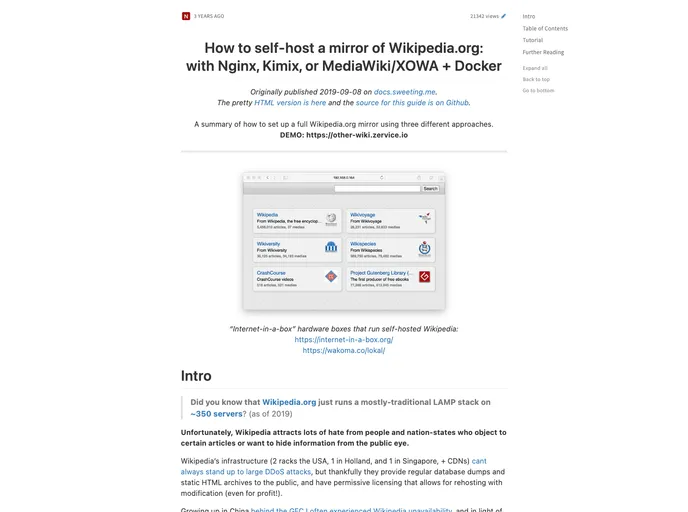 Guide and tools to run a full offline mirror of Wikipedia.org with three different approaches: Nginx caching proxy, Kiwix + ZIM dump, and MediaWiki/XOWA + XML dump