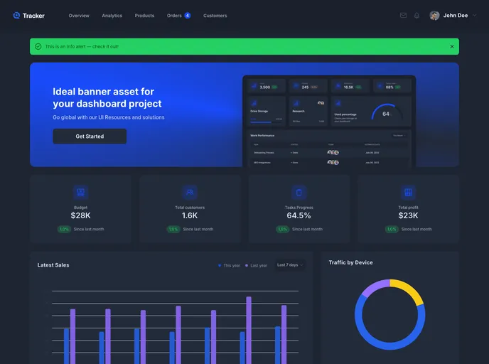 Tracker is a free one-page dashboard Tailwind CSS HTML template designed specifically for project management. It offers a clean and professional design that is fully customizable with Tailwind CSS. The template comes with custom components such as a Kanban board, data management table, and call-to-action banners to help users efficiently manage projects while maintaining a sleek user experience.