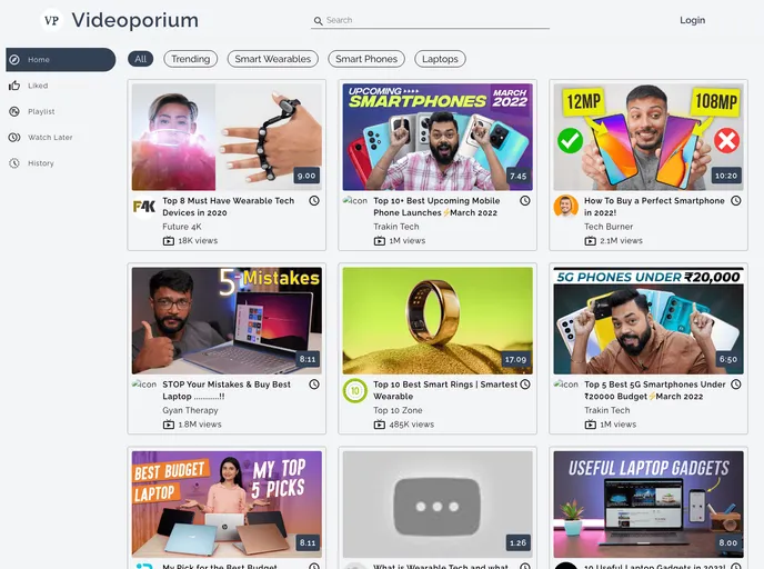 Videoporium is a video library built with ReactJS, here you will find curated list videos on the best smart gadgets, like smart watches, smart phones, best laptops. With features to add a video to watchlater, to creating your custom playlist videoporium has it all.