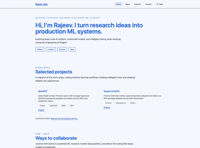 RajeevAtla.github.io is a personal website created by Rajeev Atla. This website serves as a platform for Rajeev to share information about himself and his work. It provides visitors with an introduction to Rajeev and serves as a hub for accessing his projects and contact information.